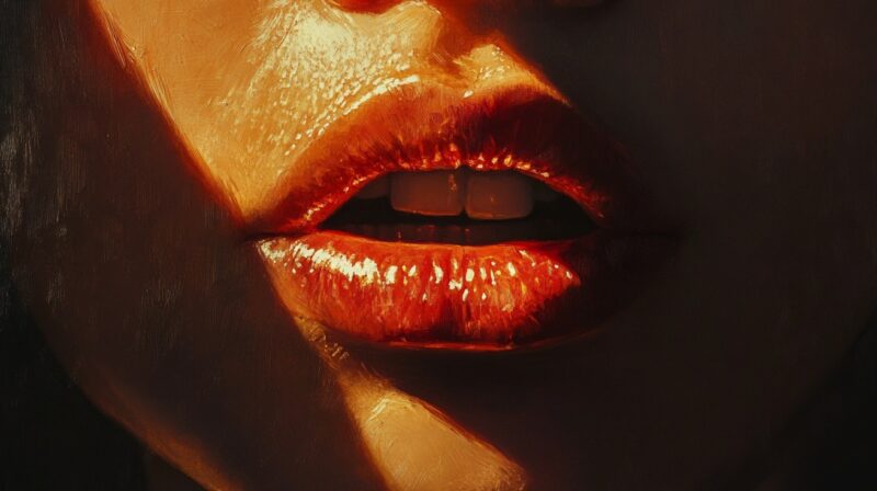 Close-up of sunburned, glossy lips with warm lighting and artistic texture